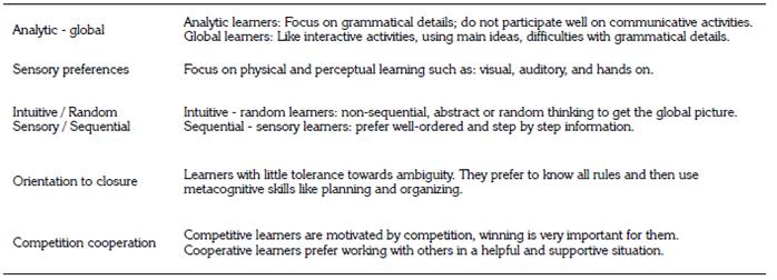 Learning is not homogeneous as approaches and strategies are not equally suitable to all students. This means that individuals draw on different approaches to learn, as asserted by Dunn and Griggs (1988) “learning style is the biologically and developmentally imposed set of characteristics that make the same teaching method wonderful for some and terrible for others” (p. 3). In the same breath, Oxford (2003), Ehrman and Oxford (1990), and Shrum and Glisan (as cited in Richards & Renandya, 2002), assert that dimensions in learning styles, such as global or analytic, auditory or visual, contribute to language learning (see Table 1). To conclude, all dimensions of learning styles need to be considered in the language input and classroom interaction.