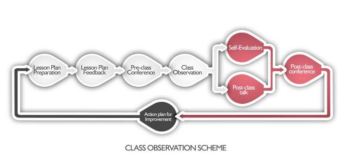 Firstly, the humanistic paradigm proposed by Randall and Thornton (2001) allows for the interaction between experiential learning theories, class-centered counselling, and reflective practice and lays the foundation for the continuous professional development of the teacher as an individual. Secondly, Vygotsky’s zone of proximal development (ZPD; Vygotsky, 1978) allows for the construction of knowledge through dialogue and interaction. In this interaction, the student-teacher is aided by the tutor in the process of advancing through their ZPD by means of scaffolding. This is evident in the class observation scheme, where the tutor observes the student-teacher and helps them to build new knowledge (see Figure 1).