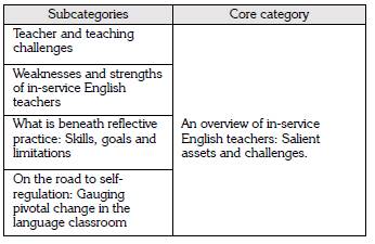 Four main dimensions were unveiled in the study. These included teacher and teaching challenges, weaknesses and strengths of in-service English teachers, target goals and limitations in reflective teaching, and difficulties in endorsing self-regulation (see Table 1). These categories integrate the core category of the study: An overview of in-service English teachers: Salient assets and challenges. These core aspects helped identify the profiles and factors associated with the difficulties for the endorsement of reflection, learner-centeredness, self-regulation, and thus integrate the fusion of principles we advocate for, towards a dynamization of the learning and teaching practices in the language classroom.