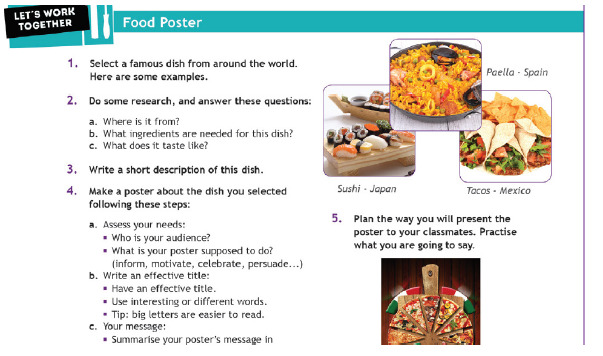 The exercise named Food Poster represents a typical knowledge activity in the English, Please! series (figure 1). In this assignment learners are expected to find information about a traditional dish from around the world and to design a poster in which they can display their information.