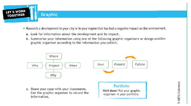 According to step 2, population can refer to textbooks. In this case, the population is the English, Please! series, a high school-level collection of textbooks and supporting materials intended for 9th, 10th and 11th graders in the Colombian high school system. This series is the first in Colombian history to be delivered by the MEN for public high schools in the country. They were developed as a result of an interinstitutional agreement between the MEN and the British Council, with support from the Fundación Empresarios por la Educación. The series consists of a kit containing material for each level (1, 2 and 3, for grades 9, 10 and 11, respectively). The set of materials for each level includes: one student’s book, one teacher’s guide, an accompanying audio CD and an online workbook. Each English, Please! level contains four modules, and each module focuses on a different topic. For each topic, students complete a project designated by the textbook. The modules start with an introductory section in which every new topic is explored. The expected language learning outcomes and the final project are also presented. Following the introduction, there are three units, each including number of lessons. The first two units explore different subtopics related to the module topic and provide students with activities for practising language strategies that will allow them to work on various aspects of the final project. Following are some of the activities incorporated into each lesson: