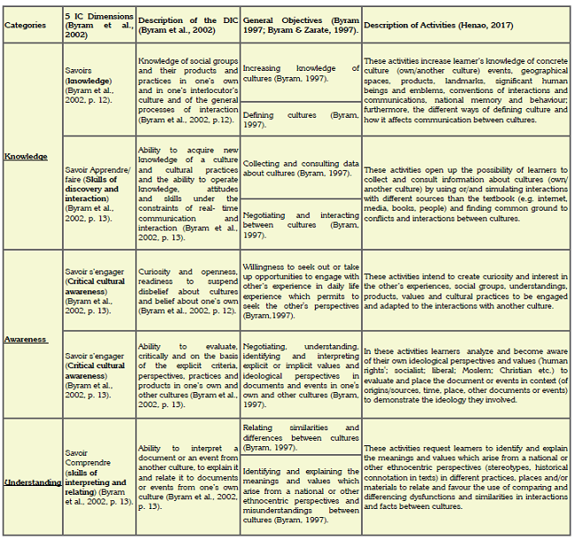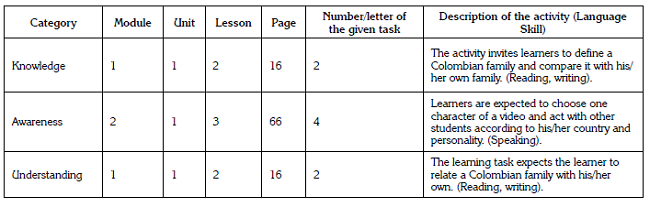 The criteria and instruments applied to the collection of data and the analysis of the activities in this study were aligned with the concepts and definitions that Byram presented in his seminal work Teaching and Assessing Intercultural Communicative Competence (1997), as well as in Developing the Intercultural Dimensions in Language Teaching: A Practical Introduction for Teachers (Byram, Gribkova & Starkey, 2002). The CEFR was also used as a point of reference, since Byram’s theories and concepts have already been incorporated into educational contexts (Council of Europe, 2001). We specifically targeted the key concepts of “knowledge, awareness and understanding” (Council of Europe, 2001, p. 103) which are developed later in this paper, as they contribute to the definition of the concept of intercultural awareness in the CEFR. These concepts support a wider view and appreciation of cultures, which is not limited to factual information, and data and statistical figures of the target language society. Rather, they are based on a progressive understanding of similarities and differences between local and foreign cultures, ideas and values, and the fostering of a respectful dialogue among language learners. With this background, we placed the activities of the modules in a table, and we examined, whether or not, they matched the definitions and descriptions of Byram et al. (2002); Byram (1997); Byram & Zarate (1997); Henao (2017). (Appendix 1).