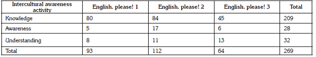The number of activities found in each textbook was then tallied, and this figure was compared with the activities labelled as intercultural awareness activities. In the three textbooks there were 1405 activities in total, but only 269 could be classified as intercultural awareness activities. The vast majority of these activities fall into the knowledge category (table 2).