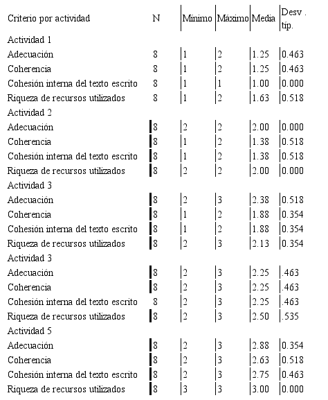 Los trabajos de los estudiantes fueron analizados en cuanto a su adecuación, coherencia, cohesión y riqueza. Los criterios que se mencionaron fueron evaluados a partir de una escala de 1 (mínimo) a 5 (superior), en razón al desempeño a cada actividad. Luego de analizadas las actividades entregadas por los estudiantes y aplicados los criterios a cada una de ellas, se aplicó la escala de 1 a 5 para su interpretación.