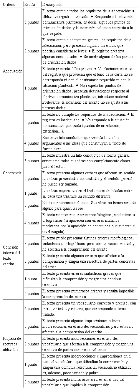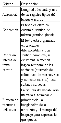 Con base en lo anterior, se desarrolló una tabla teniendo en cuenta los criterios utilizados por exámenes internacionales de proficiencia en inglés, como Cambridge (1988) y TOEFL (1990). Dichos criterios correspondieron con el objetivo de la investigación y facilitaron el análisis del desarrollo de la habilidad escrita del idioma inglés durante todo el proceso. A continuación, se explican en detalle los criterios y las escalas de evaluación, estas últimas adaptadas por las investigadoras.