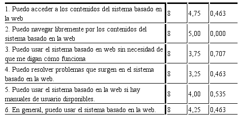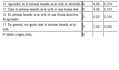 Es así como la media del ítem “Uso del sistema basado en la web” es X = 4,25 (S = 0,707) y el puntaje promedio del enunciado “El número de horas que gastó en el sistema basado en web” es X = 4,63 (S = 0,518) (aproximadamente 2 horas y 45 minutos diarios).