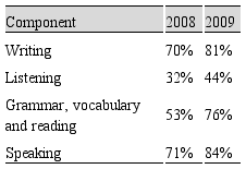Table 1 shows that in 2009, the percentage of teachers who passed the four components of the examination increased. The listening component remains the weakest of the areas, and speaking is the one with the best figures. Additionally, the components of grammar, vocabulary and reading are the areas that increased the most in the second application of the test. To our knowledge, English teachers in Chile in the school system need not only more support to improve their level of proficiency in the language but also special support to enhance their performance when delivering the English class.