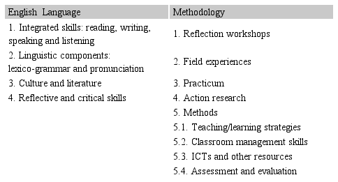 In this respect, Abrahams and Farias (2010, p.116) concluded that the new profile of English teacher preparation programmes must integrate a curriculum that includes the following two main strands: English Language and Teaching Methodology, which have their own sub-components as shown in Table 2.