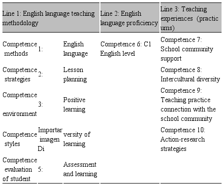 The programme identified 10 competencies grouped according to the following three main lines: 1) English language teaching methodology, 2) English language and 3) teaching experiences (practicums) as shown in Table 3.