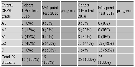 Although the programme is in its fourth year of implementation, some preliminary results could be reported in the English language proficiency and pedagogical knowledge acquisition of the students. Initially, there is evidence of the improvement of the English level of the students after the mid-point progress evaluation applied in the second year. Table 4 exhibits the results obtained by the first and second cohorts of the students.