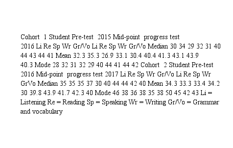 The improvement in the four language skills is evident as the increase in the student results in the grammar and vocabulary component in both cohorts in the mid-point progress test. The previous results are aligned with what Cammarata and Tedick (2012) confirmed in regard to the results achieved by students being part of immersion programmes who are able to obtain good levels of proficiency in the target language and in standardised English tests. At the same time, when analysing individual grades, the component that showed more improvement in both cohorts was speaking, whilst the weakest component was listening as shown in Table 6.