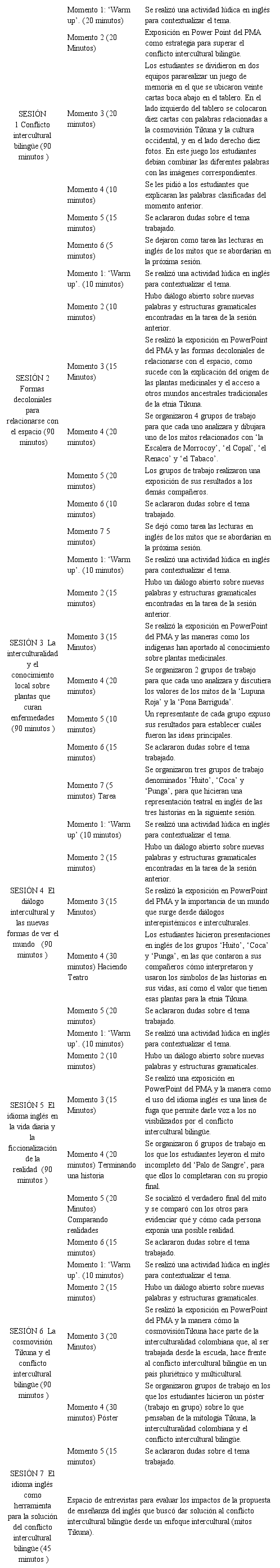 De esta manera, los mitos Tikuna permitieron reconocer la identidad individual y colectiva de estudiantes de grado 11 de un colegio público de Bogotá, a través de siete sesiones divididas en: (1) conflicto intercultural bilingüe y su relación con el medio ambiente; (2) formas decoloniales para relacionarse con el espacio; (3) la interculturalidad y el conocimiento local sobre plantas que curan enfermedades; (4) el diálogo intercultural y las nuevas formas de ver el mundo; (5) el idioma inglés en la vida diaria y la ficcionalización de la realidad; (6) la cosmovision Tikuna y el conflicto intercultural bilingüe; (7) el idioma inglés como herramienta para la solución del conflicto intercultural bilingüe.
