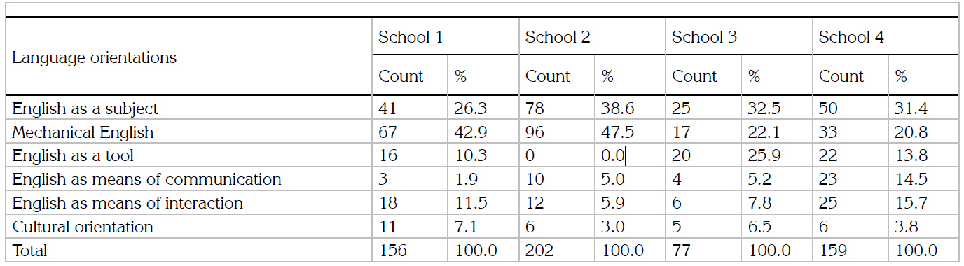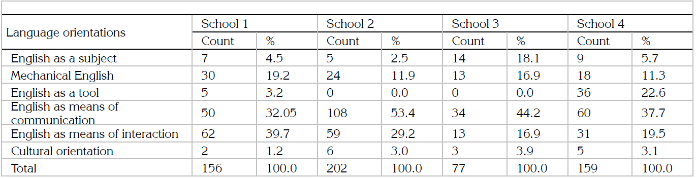 Table 2 shows the language orientations that were associated with the EFL classroom, where it is seen that across the four schools, the most commonly associated orientations were English as a subject, Mechanical English and English as a tool. When compared with Table 3, it is seen that the students more frequently associated the orientations related to communication and interaction with the outside of the classroom. The reason why this distinction is highly important was seen in the student interviews, where the students from the four different establishments explained how their interests and motivations to study English stem more from the desire to communicate and interact with others. Thus, it would seem logical to think that if teachers want to ensure student motivation in the EFL classroom, this stark division between those orientations perceived to be used in the classroom and those orientations that reflect student interest must be eliminated.