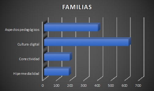 La categoría cultura digital aparece con una densidad de 617 unidades de análisis, lo que permitió constituirla como superfamilia. Lo anterior, en virtud de la consideración teórica según la cual la cibercultura o cultura digital es el resultado de la hibridación de los entornos materiales, los simbólicos y los grupos sociales que constituyeron familias dentro de este análisis.
