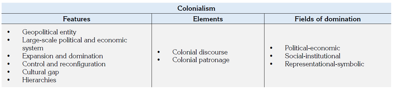 The third field of domination deals with the social representations of the colonized and the colonies. In fact, colonialism seeks to both limit the contexts where the colonized can represent themselves and ensure that those representations align with inferiority and negativity. As a result, the representations of the colonized tend to depict uncultured peoples in need of educators or belligerent masses in need of missionaries. Table 1 summarizes what I have stated about colonialism so far.