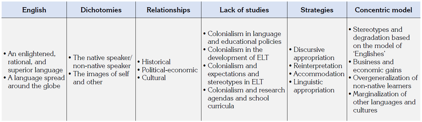 Concretely, Pennycook maintains that ELT echoes constructions of colonialism through the native speaker/non-native speaker dichotomy, as well as the images of self and other. Additionally, he claims that ELT theories and practices enact cultures and ideologies of the global north that are in fact outcomes of colonialism. With this in mind, Pennycook (1998) and authors such as Sekhar (2012) and Hsu (2017) have pointed out that applied linguistics and TESOL suffer from a loud absence of discussion about colonialism, as these two disciplines have not undertaken major research studies about: