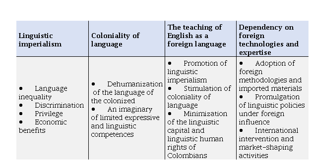 Initially, there is a generalized approval of the notion that English is the language to teach and learn over other languages. On the other hand, there is an unquestionable acceptance of the importance of using teaching methods and materials produced by western academia. Similarly, there is a problematic tolerance of exclusion and inequality represented by teacher certification and foreign language marketization. As a result of these and other colonial mechanisms, Samacá (2020) argues that