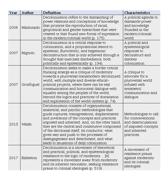 From this perspective, it is important to regard decolonization as an epistemological and political bet that emerges as a critical response to the colonializing practices and discourses perpetuated after the colonies were removed. Such bet seeks to overcome a state of cultural domination and epistemological hegemony by valuing the existence of a neglected discursive plurality and a disregarded cultural diversity. This bet has been discussed by several scholars in the last two decades, but examining these discussions goes beyond the aim of this reflection paper. However, a historical overview of some definitions and characteristics can help one identify the foundations of decolonization as a fertile ground to dislocate subalternizing power, knowledge, and being, as well as to mobilize intercultural dialogue, social justice, ethnic diversity, and human dignification. Table 4 summarizes some foundational definitions and characteristics of decolonization offered in recent years by intellectuals from the global south.