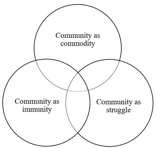 Esposito’s ideas - derived from his etymological analysis of the word ‘community’ - deconstruct the notion of community based on the common property and pre-established identity that connect members. This identity, in a sense, precedes community and gives it substance (Esposito, 2012). For Esposito, common property and identity become organizing axes where “politics and life intersect in power relations and where the thinking and acting of human subjectivity is situated and placed” (Hernández, 2018, p. 215).