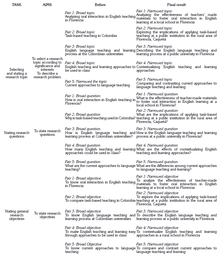 The data revealed that promoting research in undergraduate EFL teachers significantly broadened the experience and expertise in research topics and processes. Pre-service teachers expanded their research experiences and went through each inquiry stage by developing activities that led them to learn about the different parts of the research process (see Appendix 2). Another important reason was that research education provided opportunities to the contestants in order for them to broaden their research comprehension by developing diverse exercises such as reading, writing, discussions, and debates. Reading, writing, and oral exercises were alternatives that the pre-service teachers used to expand their research experiences and promote helpful knowledge in each stage of an inquiry. Such knowledge enlarged the learners’ backgrounds to select the methodology of the study and observe the benefits of other research processes such as literature reviews. Most students referred to the benefits of research as a possibility to increase knowledge and foster competencies to analyze, understand, or overcome difficulties. In our perception, the training process they had in this study was appropriate for identifying a research problem or theme and reviewing the literature by developing the aforementioned exercises.