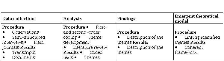 This section provides an overview of the process for analyzing the data that we collected, examined, compared, and contrasted, to finalize with the emergent theoretical model, as shown in Table 1 along with the procedures followed.