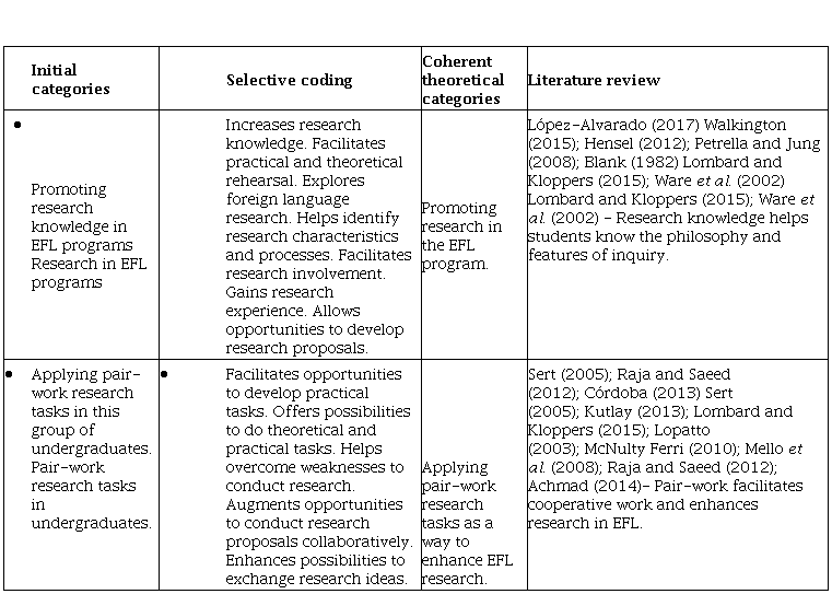 This category emerged after contrasting the information gathered and grouped into two subcategories: pair-work to foster EFL research education and pair-work research assignment as a possibility to elaborate research proposals.