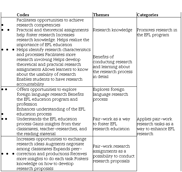 Interviewee 20 explained that working with a classmate helped realize the importance of research as a way to solve problems, get acquainted with the EFL profession, and develop research assignments (interview 5).
