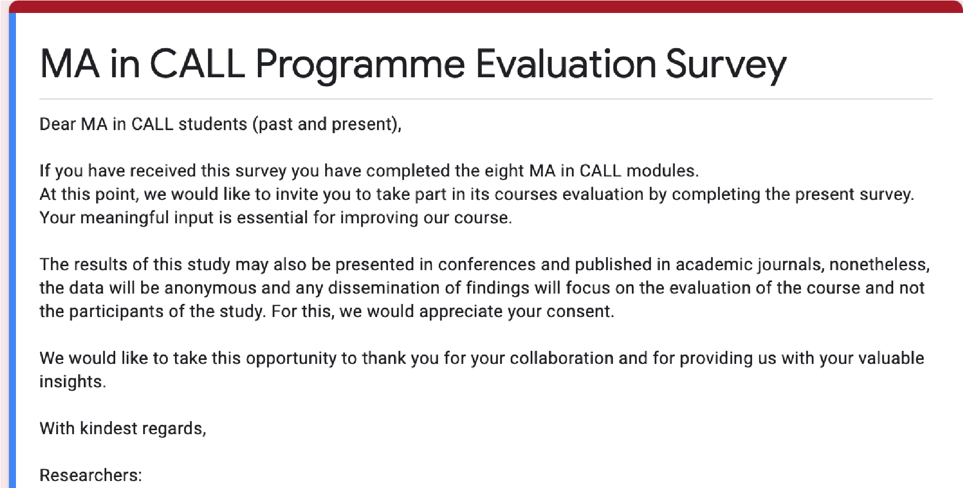The MA in CALL program was first offered in September 2015. At the end of the academic year 2018-2019, which marked the end of the first 4-year period (June 2019), a comprehensive program evaluation from the students’ perspective was carried out. This involved all the students who attended the program during those four years.