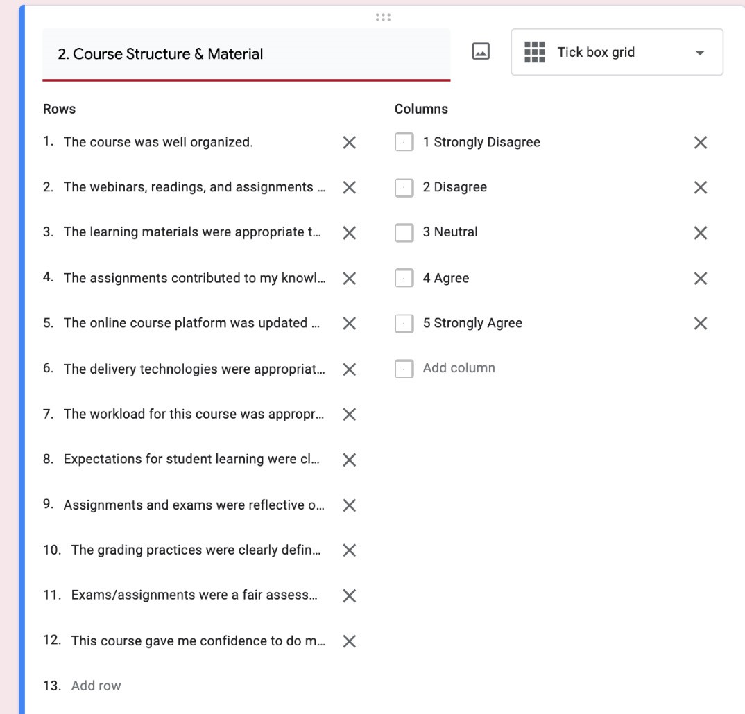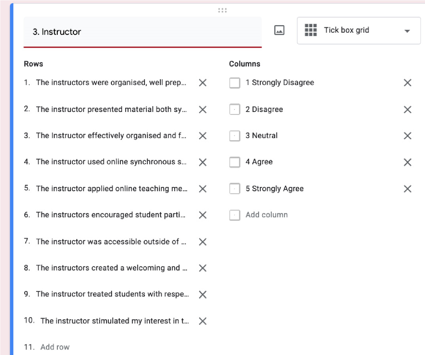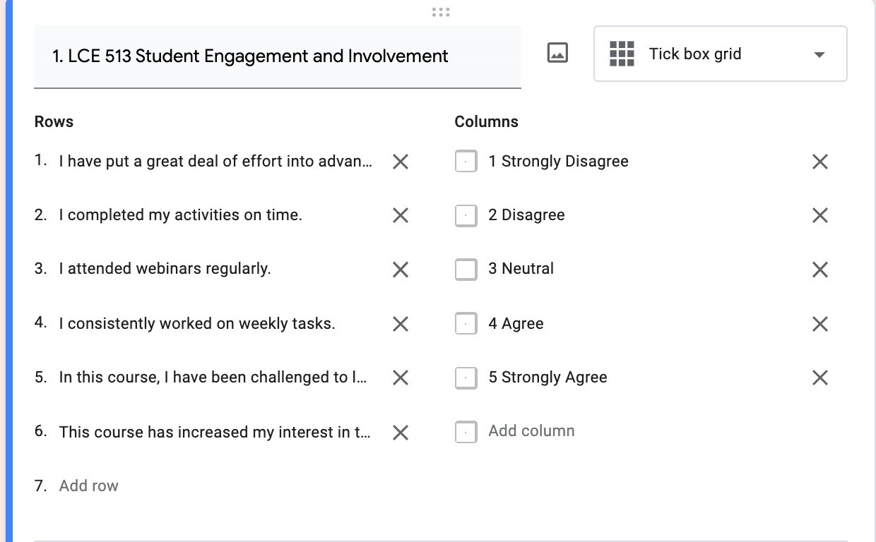 A Google Form questionnaire (see Appendix 1) was distributed to all the 25 CALAT TE course participants who were from four different yearly intakes (Nesbary, 2000. Sue and Ritter, 2007). The response rate was 76% (19 students). The questionnaire consisted of factual questions covering the respondents’ demographic characteristics and attitudinal questions exploring students’ attitudes and opinions towards the CALAT TE course. The attitudinal questions were divided into closed-ended and open-ended questions. The closed-ended questions included three five-points Likert scales asking students about their Engagement and Involvement in the course (6 items), their views towards the Course Structure & Material (12 items), and the Instructor (10 items). The five-points Likert scales ranged from Strongly Disagree (1) to Strongly Agree (5). No negatively worded items were included in the scales. The open-ended questions covered four aspects: 1) course strengths; 2) course aspects most helpful to learning; 3) course aspects that constitute obstacles four learning; and 4) feedback for module improvement. This study discusses the findings of this evaluation.