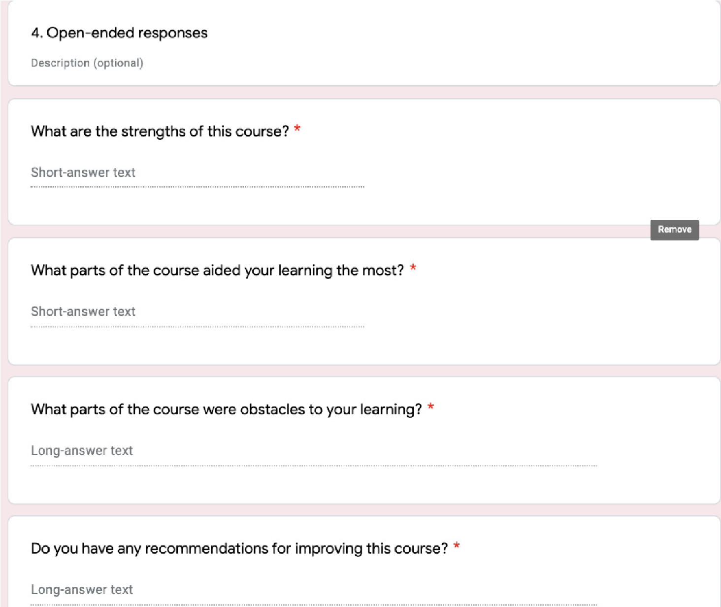 The analysis of individual items reveals that the students were highly satisfied with the course instructor. More specifically, participants gave a very positive rating to the instructor’s teaching methods, the use of synchronous and asynchronous teaching material, the learning environment created by the instructor, and the instructor’s capability to enhance the learners’ interest in CALAT TE. The fourth and final part of the questionnaire included four openended questions targeting students’ views towards the course strengths, specific parts of the course that helped students in their learning, course obstacles for learning, and recommendations for course improvement.