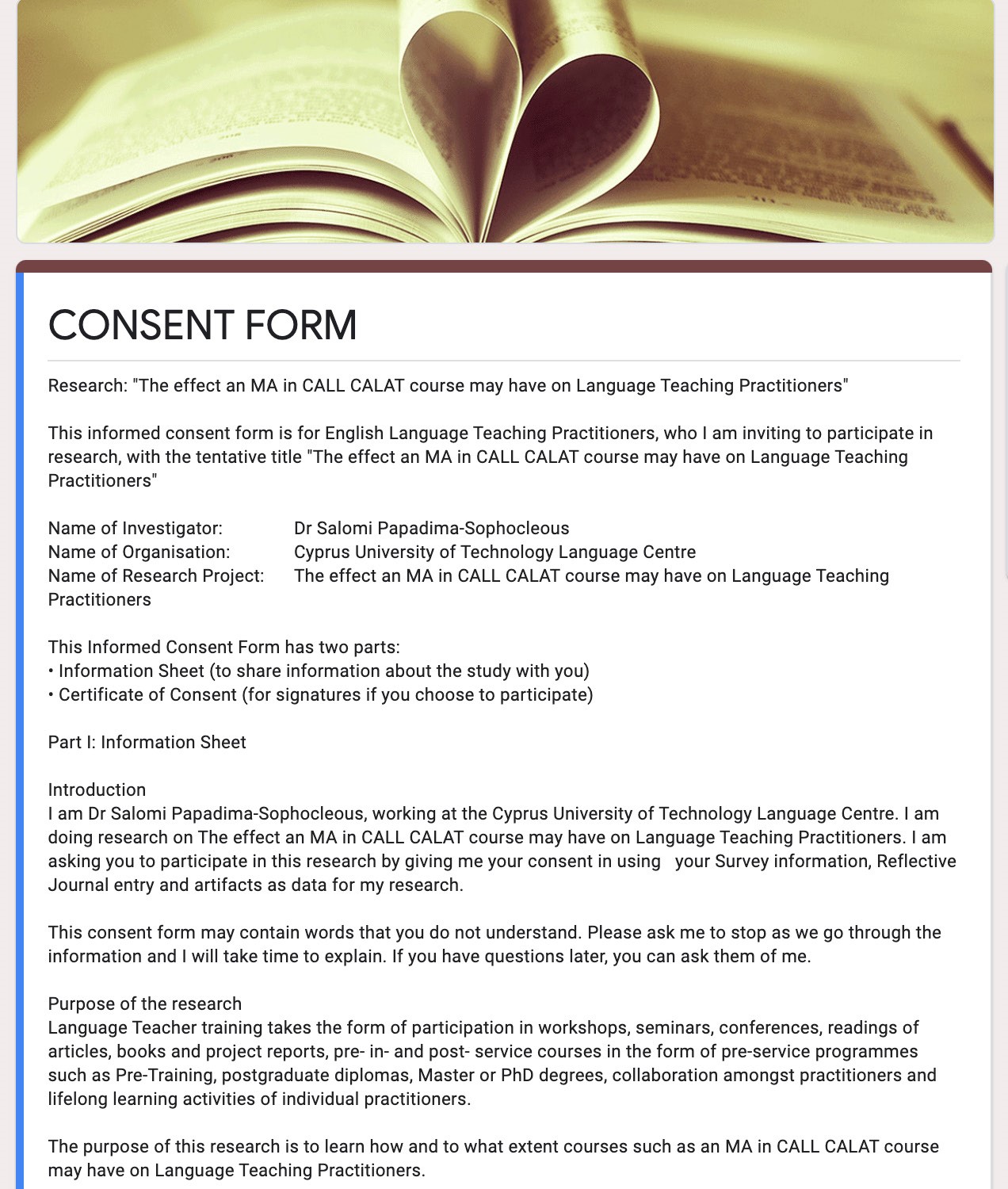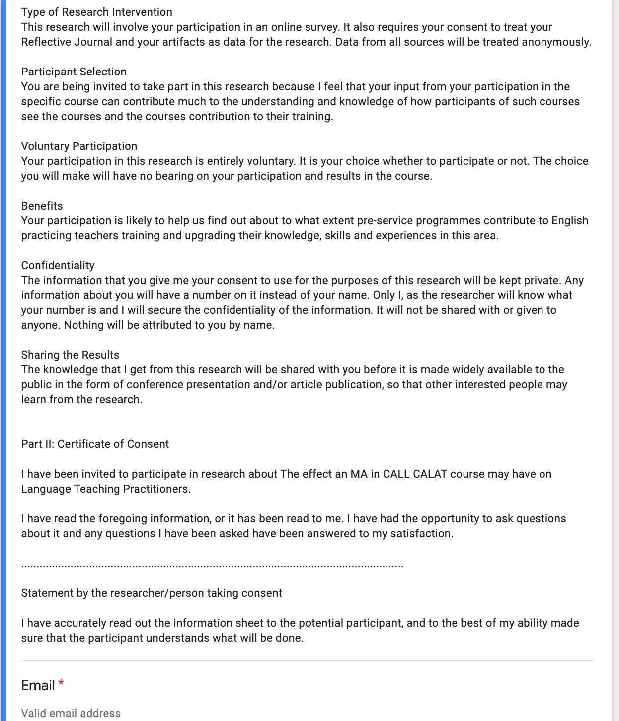 The data were collected between May and June of the academic year 2018-2019. The CALAT module students completed the online questionnaire anonymously after their consent form (see Appendix 2) was signed and returned to the researcher. Said document informed the students of the research aim, its voluntary nature, a description of the research benefits to future students of the course and their language practice, a statement of confidentiality, and contact details in case of questions. It also included the identity of the researcher and institution (Creswell, 2009).