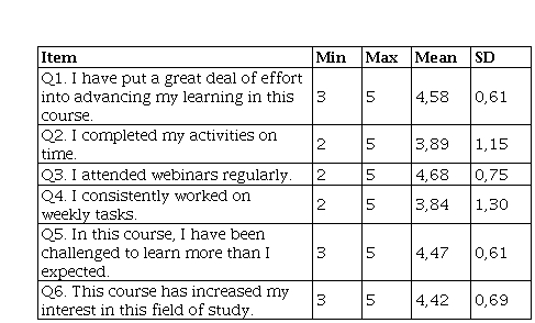 Research Question 1 enquired about the students’ level of satisfaction with the CALAT TE course. The results showed that students had a very positive perception towards the program with regards to their engagement and involvement in the course, the course structure and material, and the instructor’s delivery of the course. In the 28 items that contained scales, only three were slightly below four. These items were related to the students’ commitment to the course activities and the course workload. The remaining items had a mean average of 4,55 (SD = 0,6), which is the midpoint between Agree and Strongly agree in the five-point Likert scale.