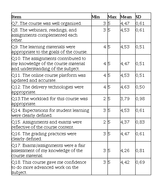 The results in Table 2 suggest a very high satisfaction level about the CALAT TE course structure and material, particularly regarding its organization, variety of webinars, reading and assignments, the course platform, grading practices, and assessment methods. The students’ confidence as a result of the course was also very positively valued. Only one item (Q13) showed a mean score slightly below 4; as in the previous scale, this is related to the course workload.