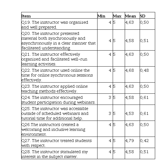 The third section of the questionnaire exained the students’ level of satisfaction with the course instructor. The scale for this measure was built with ten items, whose overall mean of scores was the highest of the three rating scales of the questionnaire: 4,63 (SD = 0,51). Results from the individual items are presented in Table 3.