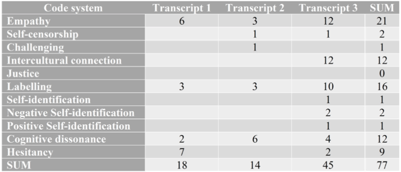 As observed in Table 1, the first interviews tend to poorly agglutinate categories related to empathy, labeling, cognitive dissonance, andhesitancy, which may be interpreted as a scarce connection with the controversial issue and a self-centered vision. However, the last interview tends to concentrate the codes around empathy, intercultural connection, and labeling with a higher frequency than the first one. This analysis is merely illustrative, so that the reader can observe where the codes tended to appear.