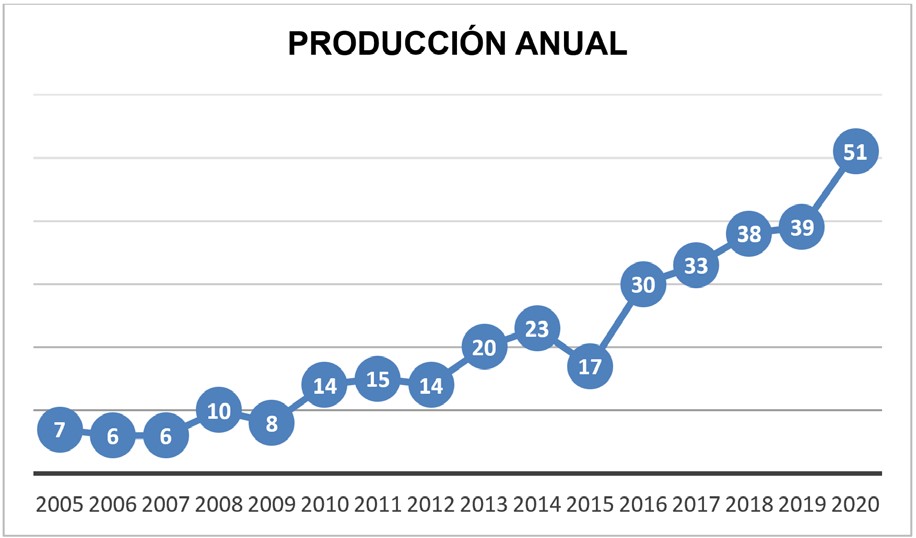 En primer lugar, se evidencia que la producción de artículos por año ha ido en aumento de manera progresiva. Mientras, en los primeros cinco años, la curva se mantiene casi estable, con una producción de 37 artículos en total, la curva muestra un crecimiento de producción significativo en los últimos cinco años, ya que se publicaron un total de 191 artículos entre 2016 y 2020, siendo este último el de mayor producción (51 artículos). Esto quiere decir que las políticas lingüísticas educativas para la enseñanza y el aprendizaje del idioma inglés son un tema de investigación que cada vez cobra mayor relevancia.