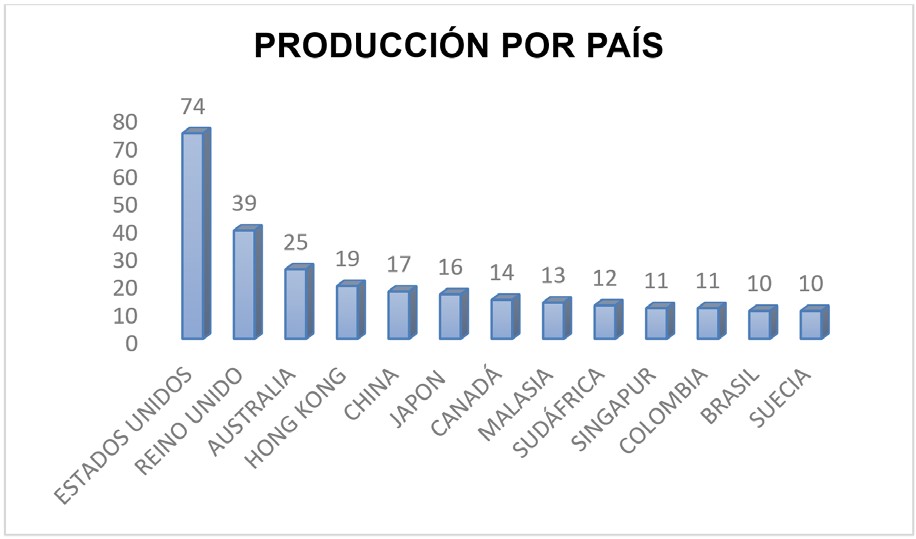 En segundo lugar, con respecto al análisis de producción por país, la Figura 2 muestra los países con un mínimo de 10 artículos indexados en Scopus. Se aprecia que países angloparlantes como Estados Unidos, el Reino Unido y Australia son los que tienen un mayor número de artículos sobre el ámbito de estudio. Un segundo grupo lo conforman países asiáticos como Hong Kong, China, Japón, Malasia y Singapur y, por último, se destacan dos países suramericanos: Colombia y Brasil, con 11 y 10 artículos respectivamente. En total, estos países suman 271 artículos de los 331 analizados, i.e., el 89 % de la producción está concentrada en solo 13 países.