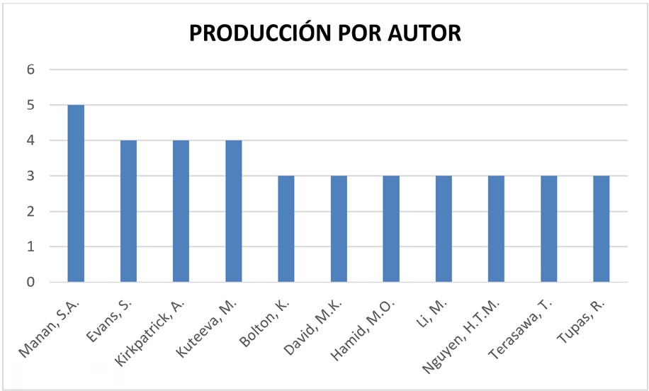 En tercer lugar, para el índice de producción por autores, se tuvo en cuenta a quienes tuvieran un mínimo de tres artículos. En la Figura 3 se observa que hay 11 autores que tienen entre 3 y 5 artículos, para un total de 38 artículos de 331 analizados. Esto quiere decir que no se cumple la ley de Lotka en este caso, según la cual un gran número de publicaciones se concentra en un reducido número de autores (Ardanuy, 2012).