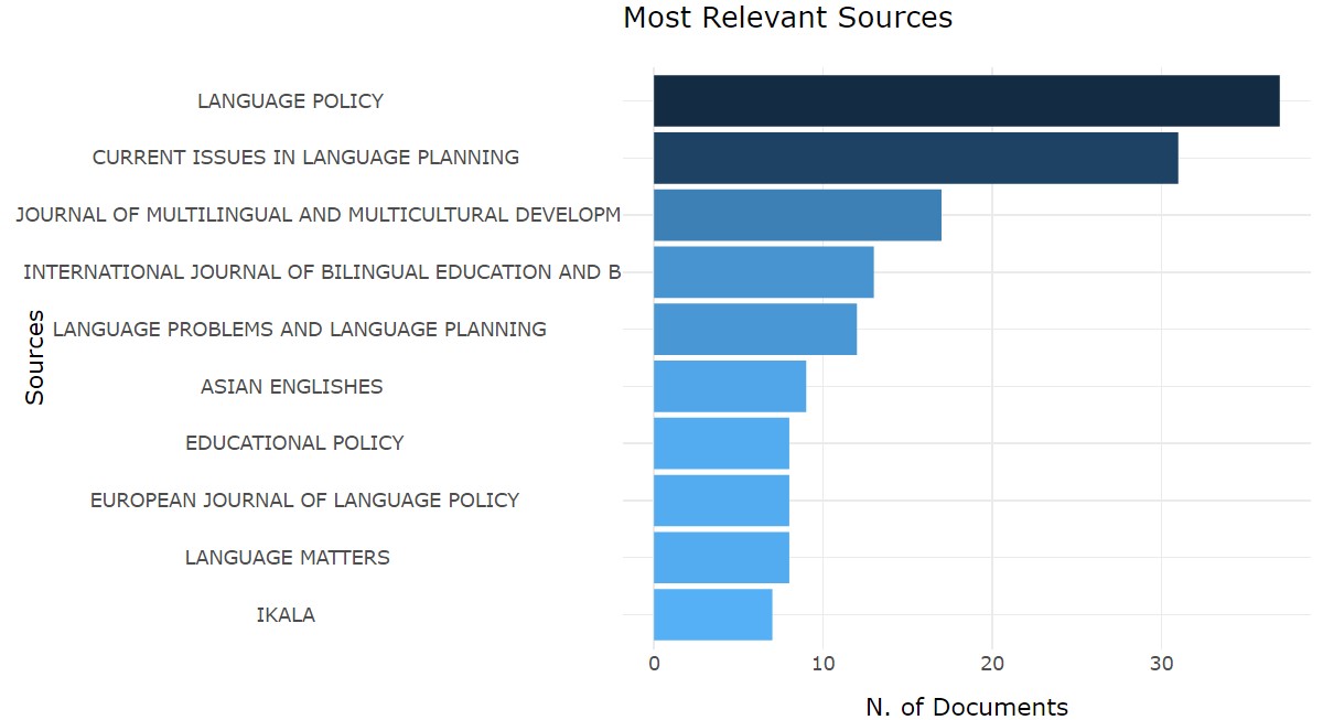 Como último indicador de producción, se tuvieron en cuenta las fuentes con mayor número de artículos publicados, siendo las revistas Language Policy y Current Issues in Language Planning las de mayor productividad, con 36 y 32 artículos respectivamente (Figura 4). Se debe remarcar que la mayoría de revistas pertenece al Reino Unido, mientras que los Estados Unidos, a pesar de tener el mayor índice de producción por país, solo cuenta con una revista en este listado.