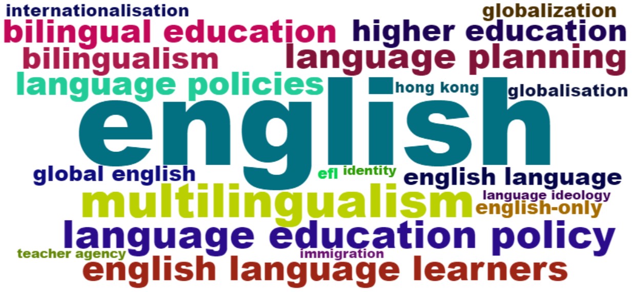 En lo que tiene que ver con bilingüismo, emergen los términos “bilingualism” y “bilingual education”. No obstante, aparece con mayor relevancia la palabra “multilingualism”, lo que denota un interés en el estudio de políticas que no solo promuevan el aprendizaje del idioma inglés, sino también de otras lenguas. Sin embargo, en la nube también son recurrentes palabras como “English-only” “EFL”, “global English”, “internationalisation” y “globalisation”. Esto denota el carácter hegemónico y dominante de las políticas lingüísticas de este idioma.