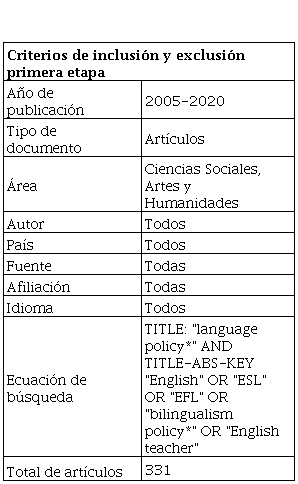 Los descriptores que orientaron la búsqueda inicial en Scopus fueron “language education policy” [política lingüística educativa], “bilingualism” [bilingüismo], “English or ESL or EFL” (idioma inglés o inglés como segunda lengua o inglés como lengua extranjera) y “English teacher” [maestro de inglés]. A partir de estos descriptores se aplicó una ecuación de búsqueda utilizando operadores booleanos, teniendo en cuenta los criterios de inclusión y exclusión que se muestran en la Tabla 1.