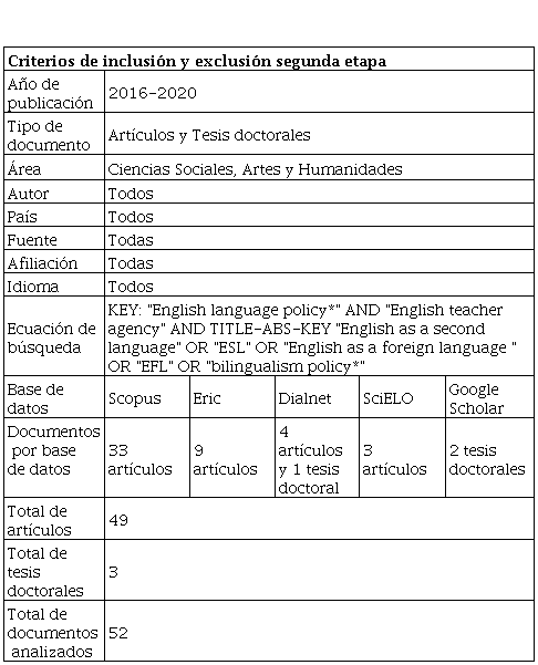 En la segunda etapa, además de Scopus, se utilizaron otras bases de datos como Eric, Dialnet, SciELO y Google Scholar, y se restringió el margen de búsqueda a los últimos cinco años, como se muestra en la Tabla 2. Por otra parte, se incluyó el descriptor “English teacher agency” (agencia del maestro de inglés), el cual resultaba relevante para lograr el objetivo de identificar las investigaciones que abordaran el rol del maestro frente a las políticas lingüísticas del idioma inglés.