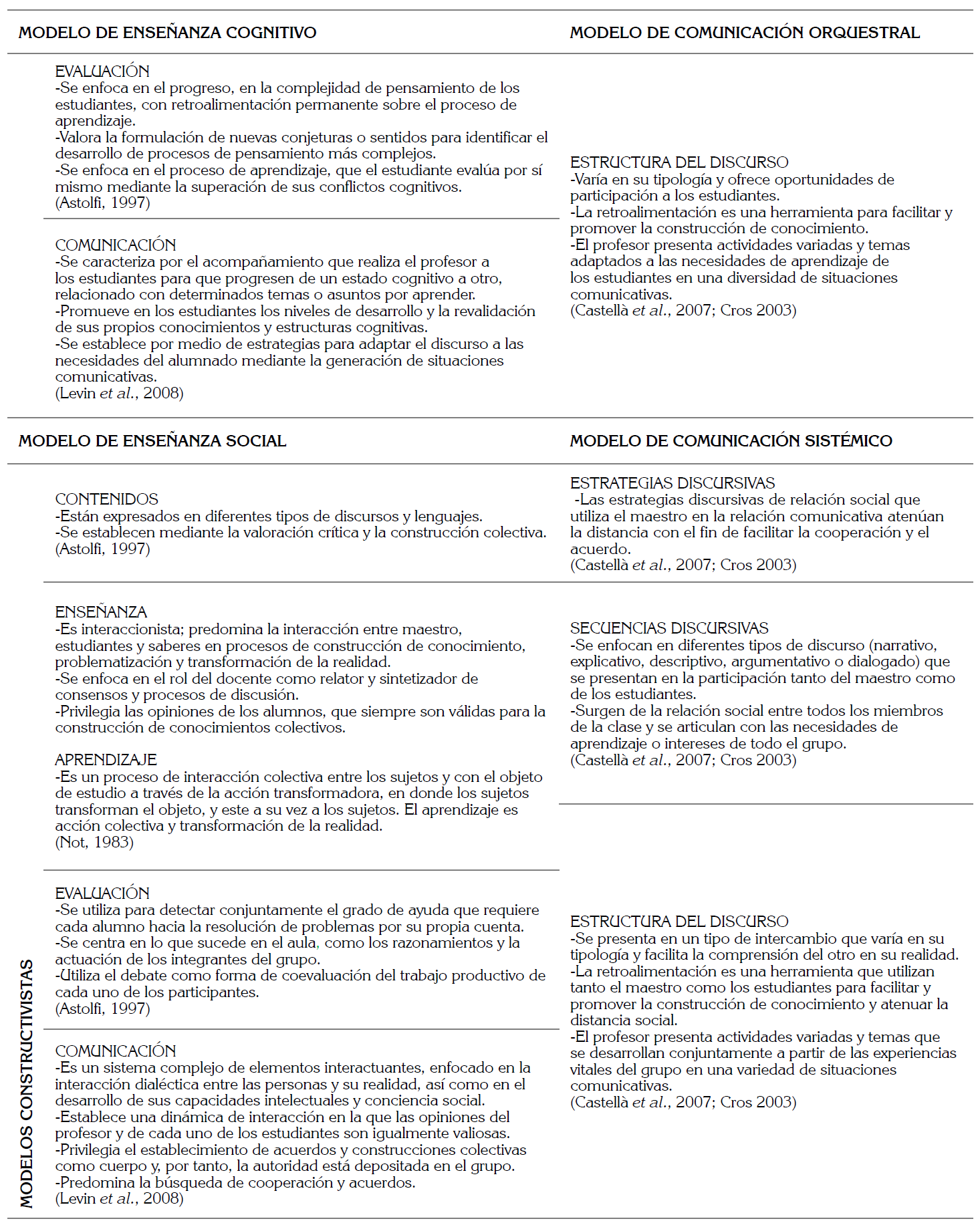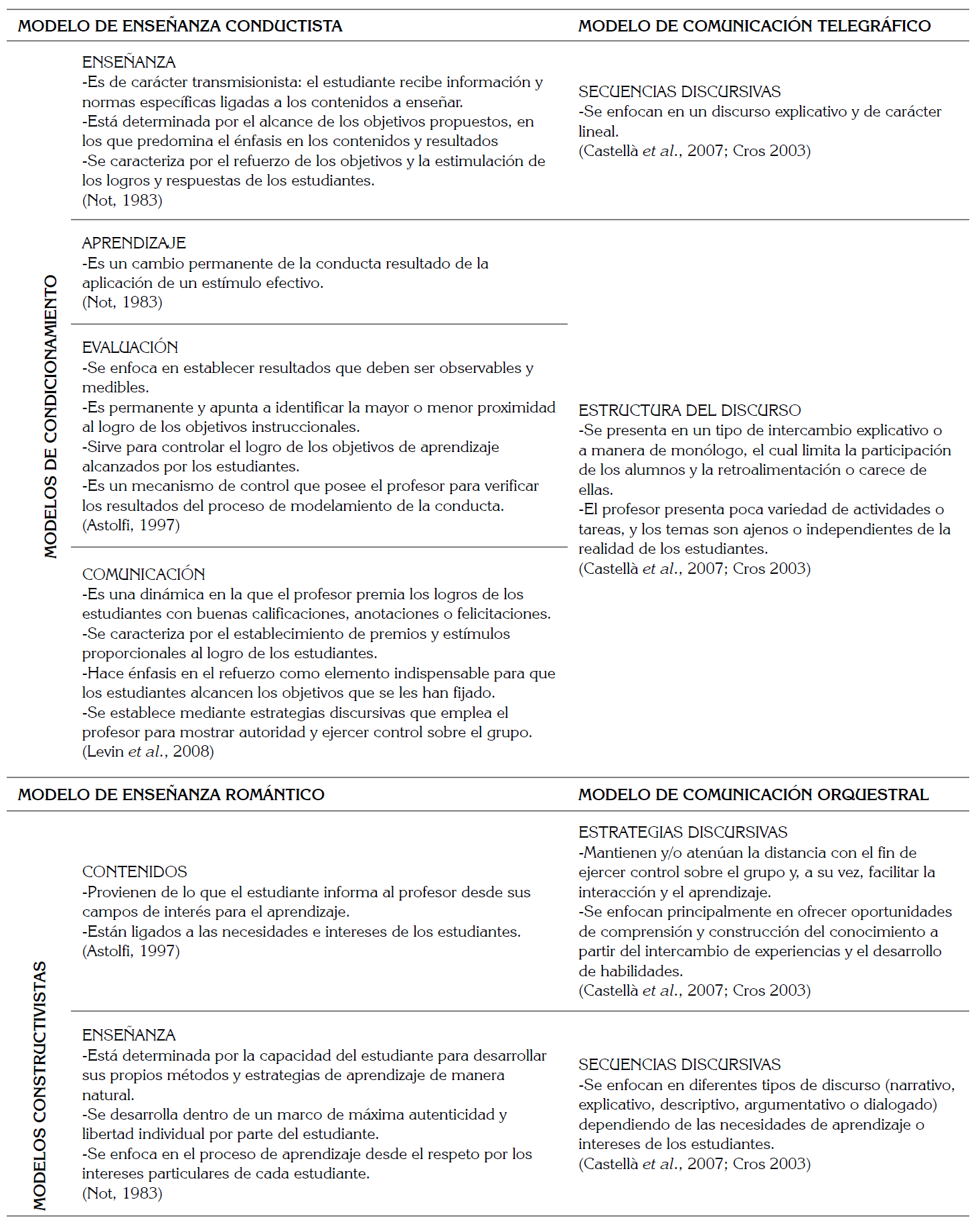 Dado que aquí se asume que en los modelos de enseñanza se expresan los diferentes modelos comunicativos, el análisis se nutre, por un lado, de elementos propios de la relación comunicativa y, por el otro, de aspectos relacionados con la estructura de la clase como categorías generales.