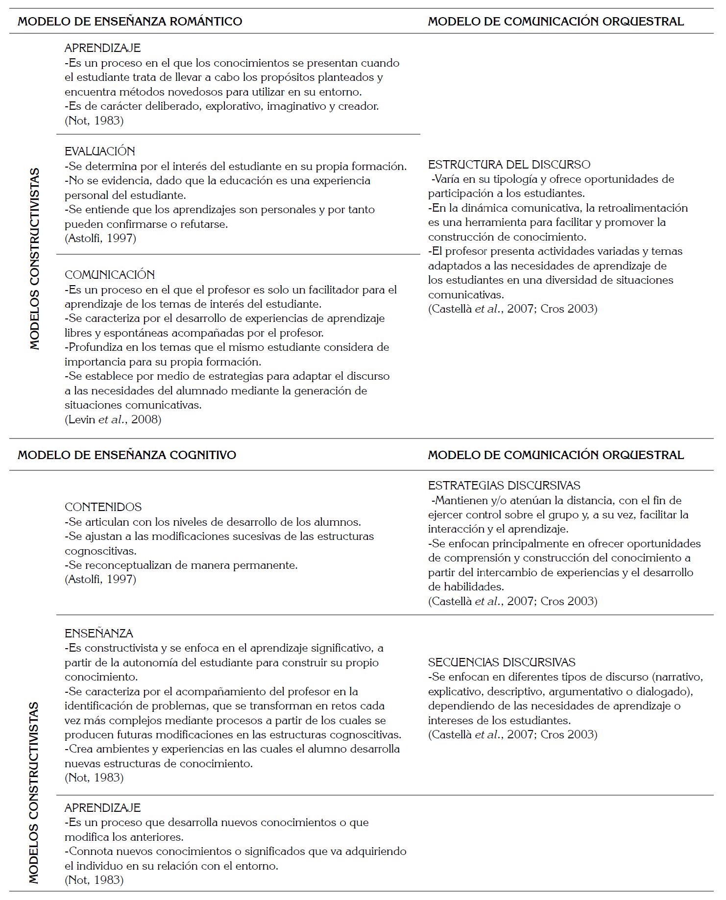 De acuerdo con las fases de inicio, desarrollo y evaluación de la estructura de la clase, se percibe una tendencia a un tipo de enseñanza de carácter constructivista, caracterizada por el acompañamiento de la maestra en la identificación de problemas que se transforman en retos cada vez más complejos y en la creación de ambientes y experiencias en las cuales los niños y niñas desarrollan nuevas estructuras de conocimiento. Asimismo, el modelo comunicativo tiende a ser de tipo orquestal, dado que la interacción se construye en procesos dialógicos de carácter bidireccional y biunívoco, por cuanto se presentan cambios de dirección en los mensajes transmitidos por Andrea y los estudiantes.