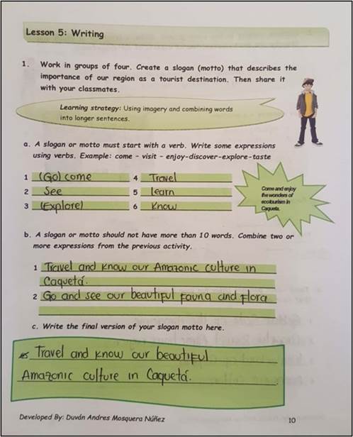 This category presents evidence of the development of the students’ writing skills featured by two recurrent patterns: working cooperatively and using the process approach to writing, which includes giving and receiving feedback. Specifically, the writing skills fostered during the implementation of the teacher-made materials are related to eliciting ideas, creating sentences, joining sentences in a coherent way, and producing short compositions. Alternatively, working cooperatively appears to be the strategy for completing most of the writing activities that required peer support.