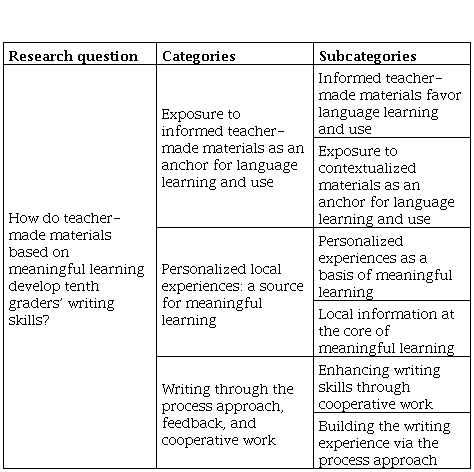The aim of this research study is to answer the following question: How do teacher-made materials, based on meaningful learning, develop tenth-grade students’ writing skills at a state-funded school in Colombia? To address this question, the following objectives were established: