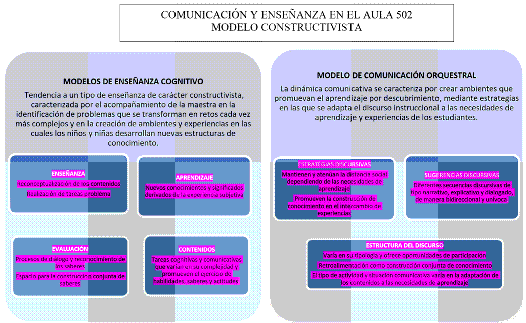 De acuerdo con las fases de inicio, desarrollo y evaluación de la estructura de la clase, se percibe una tendencia a un tipo de enseñanza de carácter constructivista, caracterizada por el acompañamiento de la maestra en la identificación de problemas que se transforman en retos cada vez más complejos y en la creación de ambientes y experiencias en las cuales los niños y niñas desarrollan nuevas estructuras de conocimiento. Asimismo, el modelo comunicativo tiende a ser de tipo orquestal, dado que la interacción se construye en procesos dialógicos de carácter bidireccional y biunívoco, por cuanto se presentan cambios de dirección en los mensajes transmitidos por Andrea y los estudiantes.