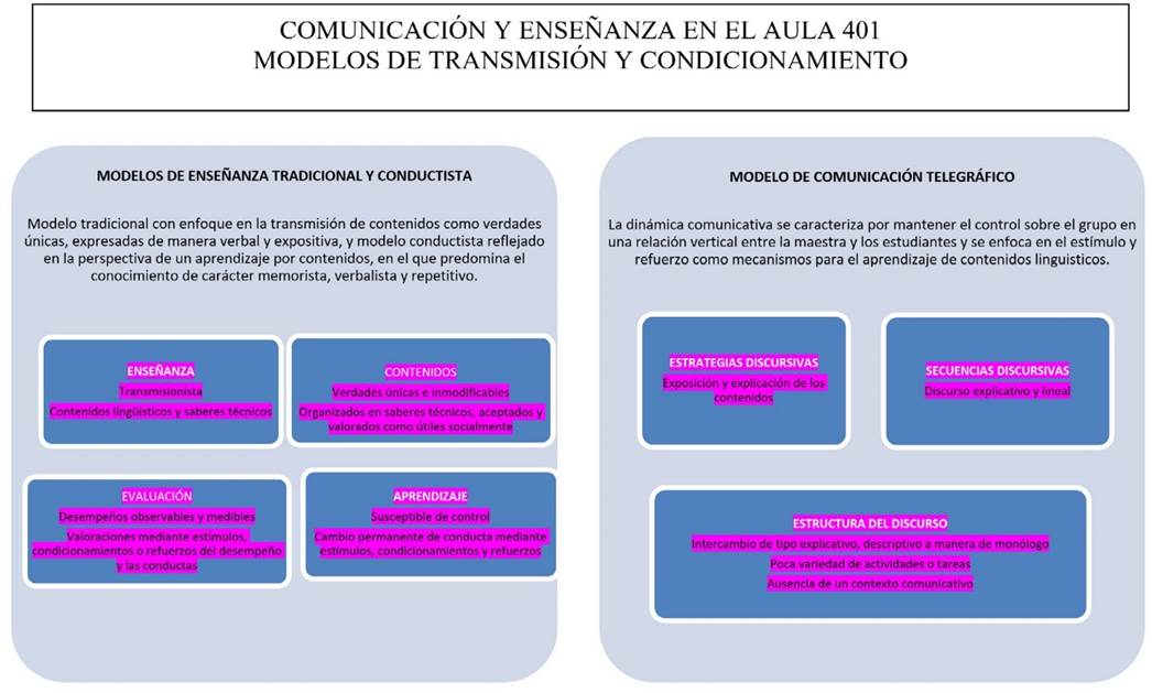 Adicionalmente, en el inicio, desarrollo y evaluación de los contenidos en las secuencias de clase, se percibe una tendencia a modelos de enseñanza tradicional y conductista. El primero evidencia un enfoque en la transmisión de contenidos como verdades únicas expresadas de manera verbal y expositiva, en el marco de una dinámica comunicativa en la que prevalecen la autoridad de la maestra y su control frente al grupo. El segundo se centra en la perspectiva de un aprendizaje por contenidos, en la que predomina la transmisión de conocimiento de carácter memorista, verbalista y repetitivo. Este hecho se establece a partir de un diálogo controlado de preguntas y respuestas concretas, en el que la valoración o evaluación tanto negativa como positiva es útil como mecanismo de estímulo, condicionamiento y refuerzo de la conducta en la interacción, tal como se observa en el siguiente fragmento de interacción entre profesor (pr) y estudiante (es) con respecto al tema de los signos de puntuación:
