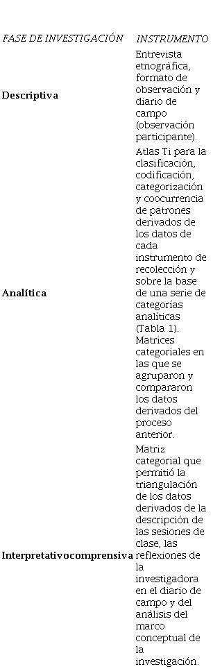 El proceso metodológico se desarrolló en tres fases. Una de ellas fue descriptiva, en la cual se analizaron los marcos de comprensión de la diversidad en la institución escolar y los rasgos de la comunicación en las interacciones entre maestros y estudiantes. Esta etapa del estudio implicó el diseño de una entrevista etnográfica que se utilizó como herramienta para avanzar en el conocimiento de la trama socio-cultural y profundizar en la comprensión de los significados y puntos de vista de los directivos, coordinadores y profesores acerca de la diversidad cultural en la institución escolar. Sin embargo, es de anotar que, por cuestiones de espacio y dados los objetivos planteados, para este artículo en particular solo se analizó la interacción profesoras-estudiantes. A su vez, se recurrió a la observación participante de la clase de español en dos aulas de grado quinto y una de grado cuarto. La descripción de los rasgos de la comunicación dio cuenta del análisis de siete sesiones con cada uno de los grupos en un lapso de aproximadamente dos años.
