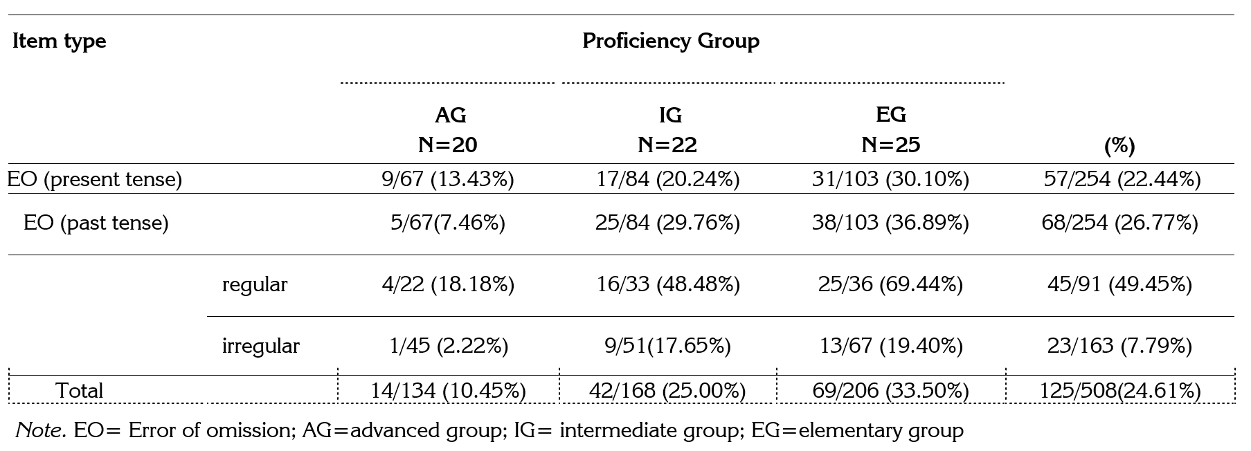 Table 1 shows that the past tense had more morpheme omission (26.77%) than the present tense (22.44%). This is related to the high omission rates (49.45%) of regular past tense verb forms.